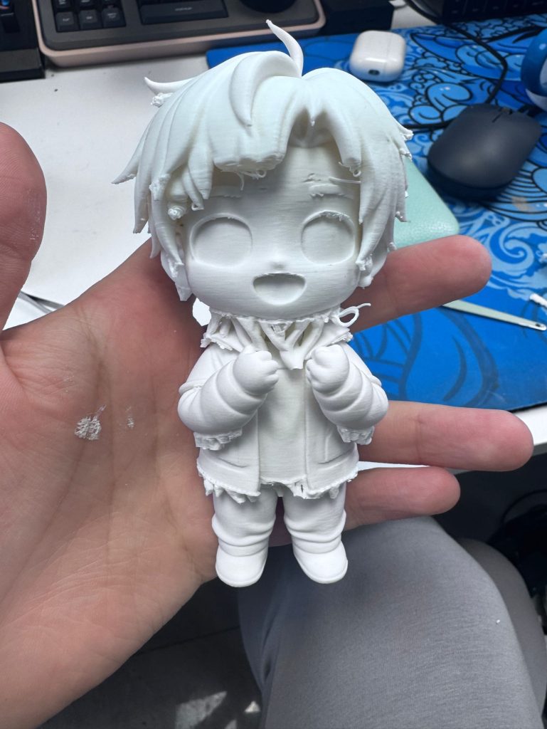 看起来效果还不错,不过脖子下面的支撑还需要优化,要不就只能用水溶支撑材料了。还有前面的刘海感觉有点奇怪。(吐槽一下3D打印的速度真的很慢,每次都要打印一整天。